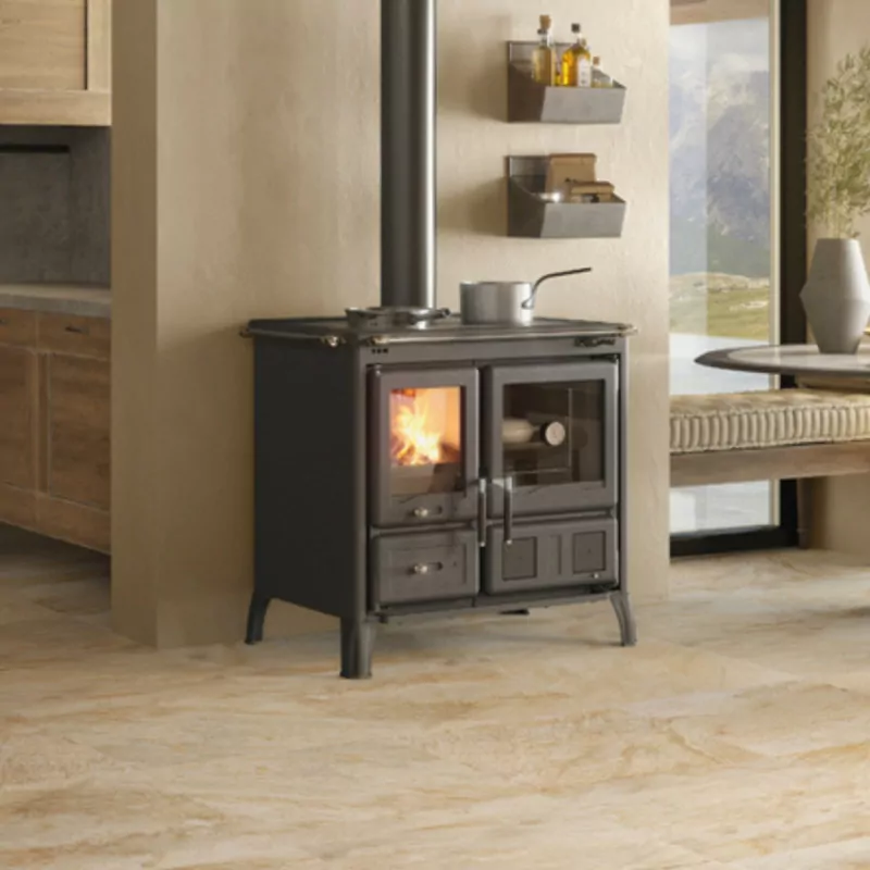 La cuisinière à bois Gardenia 5.0 de La Nordica, issue de la ligne Prestige, propose une puissance de 9,5 kW et un rendement de 86,6%. Ce modèle est capable de chauffer efficacement votre pièce tout en vous permettant de cuisiner vos plats grâce à un grand four intégré de 55L et une plaque de cuisson en fonte polie.